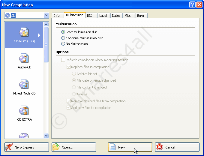 Als Nero al opgestart was, of als bovenstaand scherm niet automatisch verschijnt, klik dan op de knop 'New' om het scherm alsnog in beeld te krijgen: